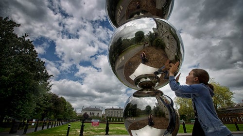 The Apples & Atoms Sculpture was designed by Eilis O’Connell and consists of a series of mirrored stainless steel spheres, inspired by Walton's drawings, and evoking those used during Walton and Cockcroft’s experiment. The spheres reflect specially planted native Irish apple trees to pay homage to Walton's other interest for growing fruit trees, his intellectual rigour and his figure as a teacher and father.