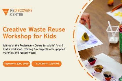 Join us at the Rediscovery Centre for a fun, hands-on Arts & Crafts workshop! Kids aged 6 to 12 will turn waste materials - like fabric, cardboard, and sweet wrappers -into creative treasures. Perfect for young makers with big imaginations.