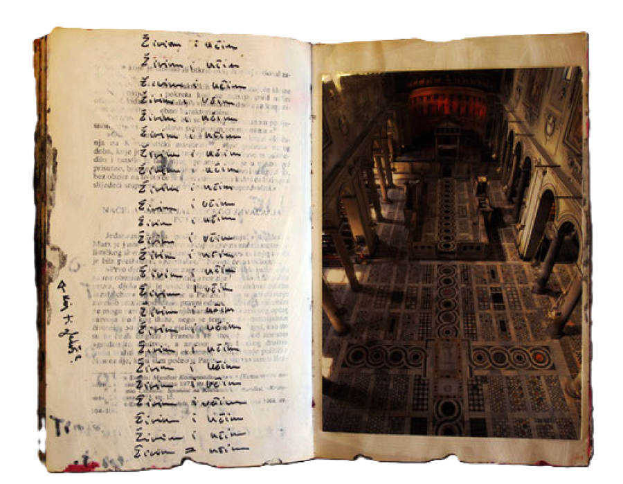 The exhibition features a workspace and art book installation compiled from 10 years of compulsive collecting, layering and writing; a selection of absurdist trompe l'oeil featuring medieval woodcuts and soft candy emoticons within godly skies; alongside a gut wrenching soundscape installation and performance exploring bodily anxiety and possibilities of transmutation.